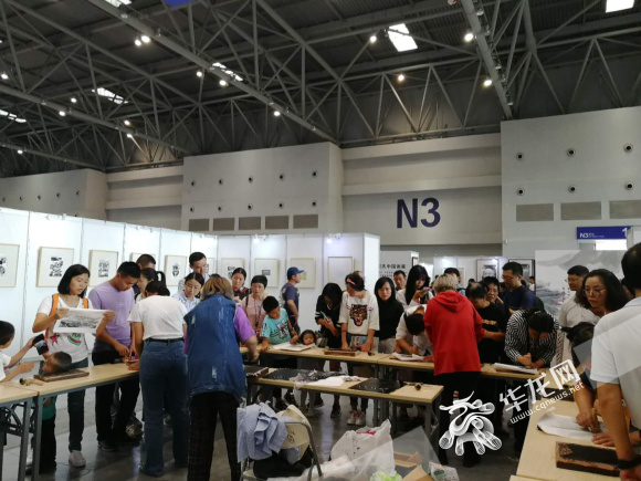 重慶文藝網(wǎng)9月8日20時(shí)30分訊(記者 張義)“姐姐我想印這幅作品,你可以幫我鋪一下紙嗎?” 9月8日,記者在文博會(huì)N3館的川美版畫系展區(qū)看到,許多市民圍在版畫印制區(qū)域,認(rèn)真拓印版畫作品,場面十分熱鬧。