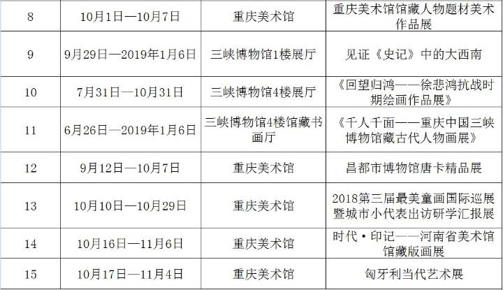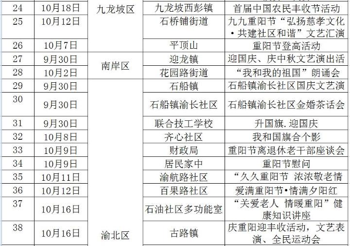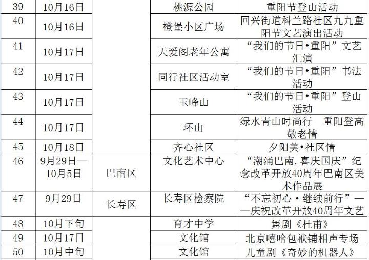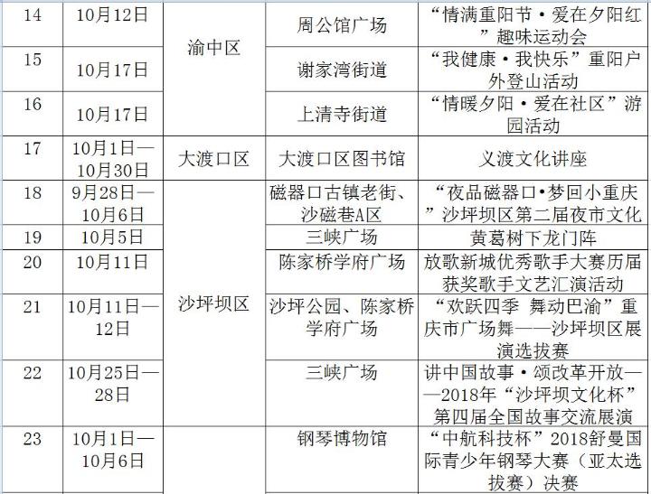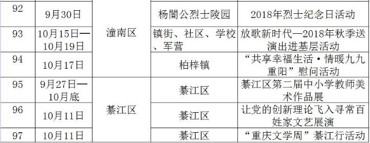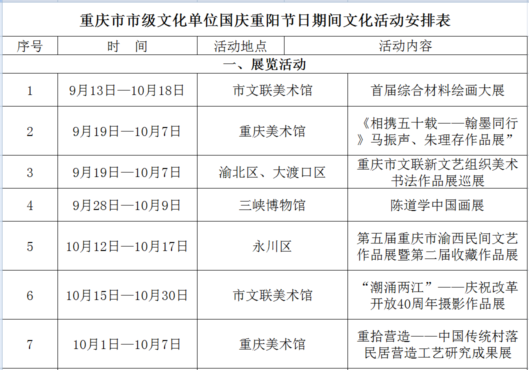 重慶文藝網9月30日6時20分訊(記者 張義)國慶、重陽節將至。為進一步營造良好的節日氛圍,滿足市民朋友在國慶、重陽節日期間的文化生活需求,重慶市委宣傳部收集匯總相關單位節日期間的文化活動,形成《重慶市市級文化單位國慶和重陽節日期間文化活動安排表》和《重慶市各區縣國慶和重陽節日期間文化活動安排表》,歡迎廣大人民群眾觀看、參與。