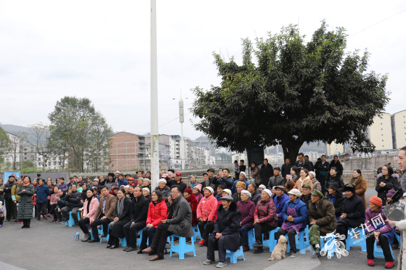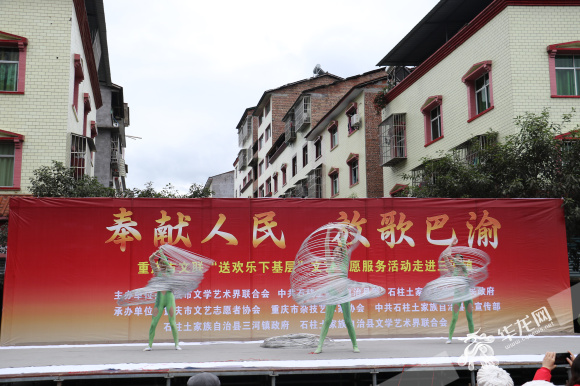 在三河鎮(zhèn),父老鄉(xiāng)親們將三河鎮(zhèn)群眾文化廣場(chǎng)坐得滿滿當(dāng)當(dāng),大家坐在黃葛樹(shù)下看演出。來(lái)自市文聯(lián)、市文藝志愿者協(xié)會(huì)、石柱縣委宣傳部、縣文聯(lián)等單位的領(lǐng)導(dǎo)也來(lái)到現(xiàn)場(chǎng),與他們同樂(lè)。