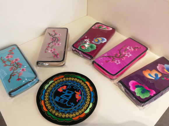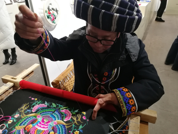 此次成果展除提供扶貧培訓企業的非遺產品可供購買外,還選取了培訓班學員的優秀作品進行展示。來自酉陽清泉茶溪5組的陳碧海就是其中一位。1964年出生的陳碧海在1993年因故致殘,之后一直待在家中,因嚴重失去勞動力,身上無一技之長,人生極度頹廢。“苗繡改變了我的悲觀失望的人生,我也與酉陽苗繡結下了不解之緣。現在,我已經正式成為苗繡員工,每個月不僅可以拿到穩定的工資,公司還為我買了五險。”苗繡是一門需要耐心考驗意志、技術含量很高的手藝,也是一項值得挖掘和傳承民間文化。陳碧海說,“世上無難事,只怕有心人。只要一個人用心學習就沒有學習不好的東西。學習苗繡技藝是改變人生的開始,也是一個修心養性磨練意志的過程。”