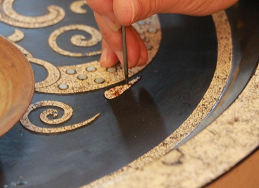 陳奇志正在進行脫胎漆器工藝畫的蛋殼鑲嵌工藝