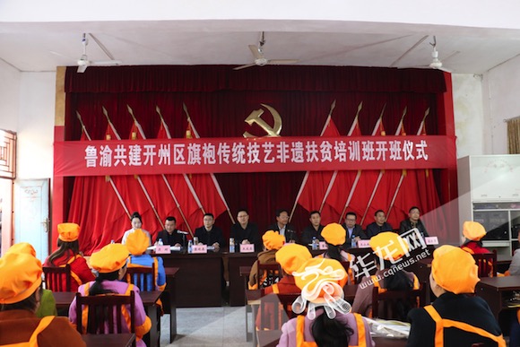 重慶文藝網(wǎng)3月19日22時(shí)32分訊(記者 趙玲 攝影報(bào)道)用一把剪、一顆針、一根線、一塊布解決貧困人群居家致富的問題。今(19)日上午,魯渝共建開州區(qū)旗袍傳統(tǒng)技藝非遺扶貧培訓(xùn)班在開州區(qū)大進(jìn)鎮(zhèn)開班,當(dāng)?shù)亓羰貗D女、貧困人群50余學(xué)員參加開班儀式。
