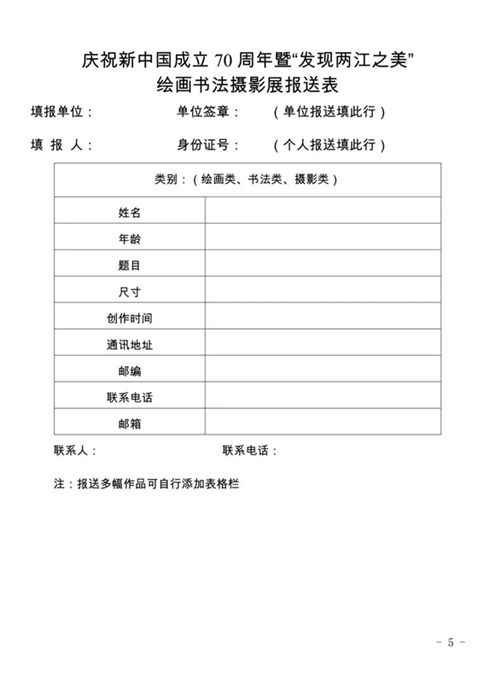 據(jù)了解,展覽作品征稿時間為2019年4月—5月,全市廣大書法、繪畫、攝影愛好者均可積極參與、踴躍投稿。報送作品應(yīng)為作者新創(chuàng)作的繪畫、書法和攝影作品;每位作者申報不超過2件作品(含合作);作品尺寸:國畫、書法、篆刻尺寸不超過六尺宣紙(拒收橫幅),其他繪畫作品尺寸在120cm×120cm以內(nèi),攝影作品為JPG格式,長邊不少于3000像素。有意向者可于2019年6月1日前將作品寄送到重慶兩江新區(qū)金州大道66號圣喬維斯11棟1-2-2。