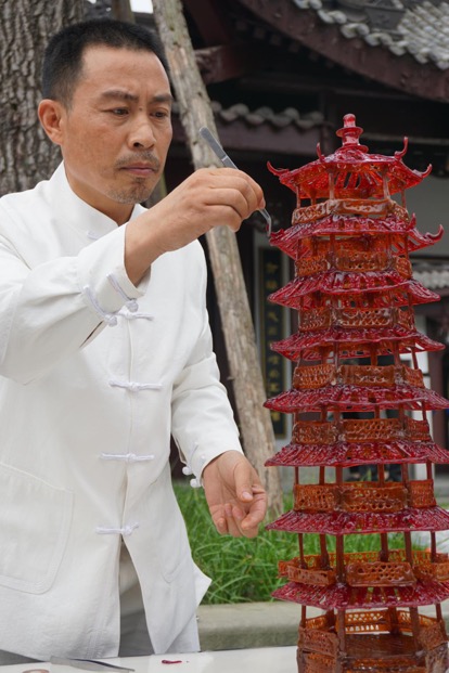 王乾坤參考家鄉(xiāng)開(kāi)州的文峰塔創(chuàng)作了糖畫(huà)《寶塔》