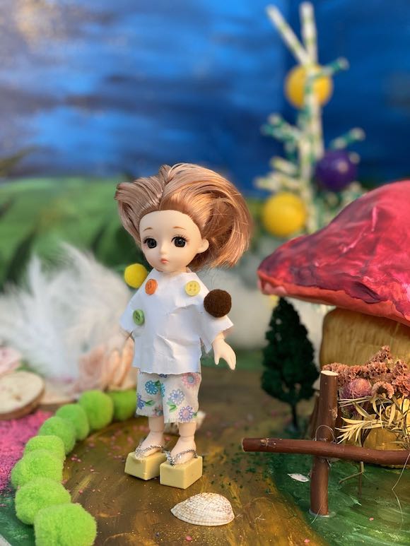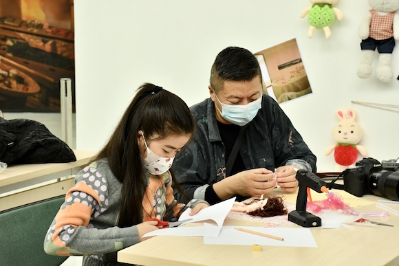 參與者使用人偶、熱熔膠槍、布料包等材料,結合自身想法和創意,先在白紙上繪制出服裝打版設計圖,再由此制作出不同風格的玩偶,將各組的玩偶置于搭設好的場景中。