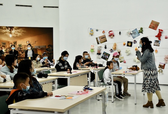 隨后,公教活動老師黎娟講授了置景攝影創作的原理,教授大家如何通過特定的形象和文化符號營造出虛擬的場景,將圖像與敘事濃縮進影像中。通過幻燈片講解、實際范例展示,構建起由觀看展覽延伸至自主創作的思路,再引導大家進行DIY設計和布置。