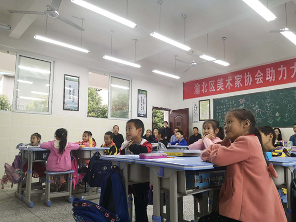 孩子是祖國的未來和希望,山區的孩子也有藝術夢想,為了助力大盛學子圓藝術夢想,為了讓他們同城區的孩子一樣享受到高質量的藝術教育,9月29日,渝北區文聯、渝北區美協為孩子們送去畫筆、顏料等美術畫材,送去了會員創作的美術作品,鄧潔老師還送去了一堂生動的美術課《我的太陽》。