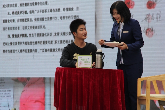 “吃得文明,一是要吃得合法,二是要吃得合理,三是要吃得衛生,四是要吃得禮貌,五是要干凈。下面我們來一個一個談,先用快板的形式,跟大家談吃得合法……”